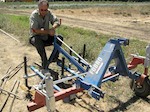 A close up of an Alloway cultivator. This tool is very adjustable and has two disks to cut along side the crop and then knives that follow to clean up weeds that are between the rows.